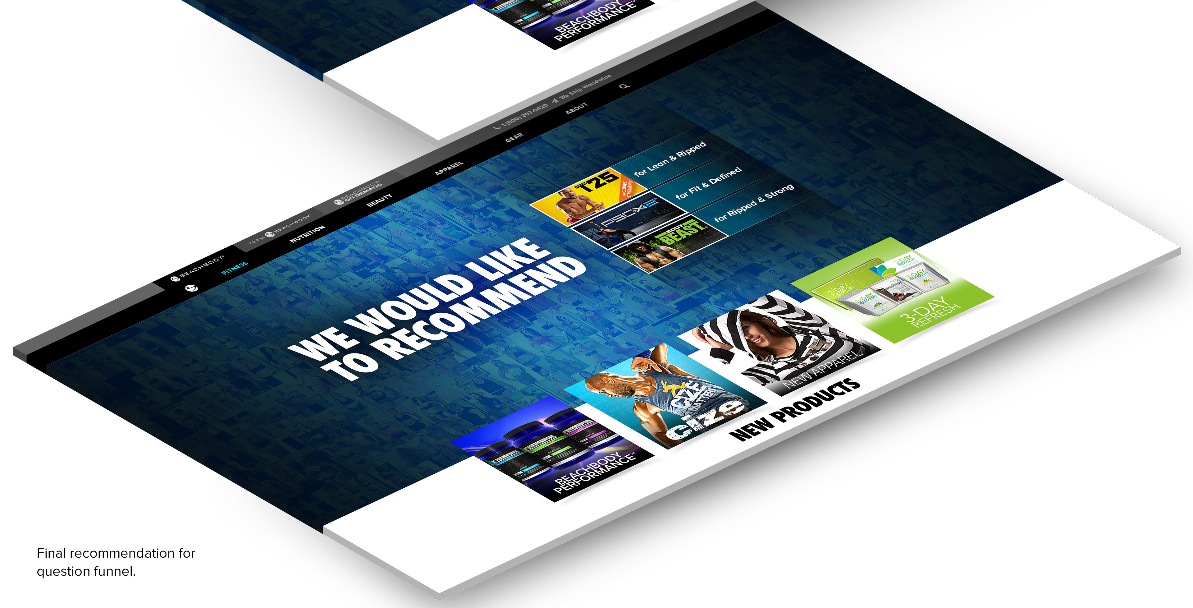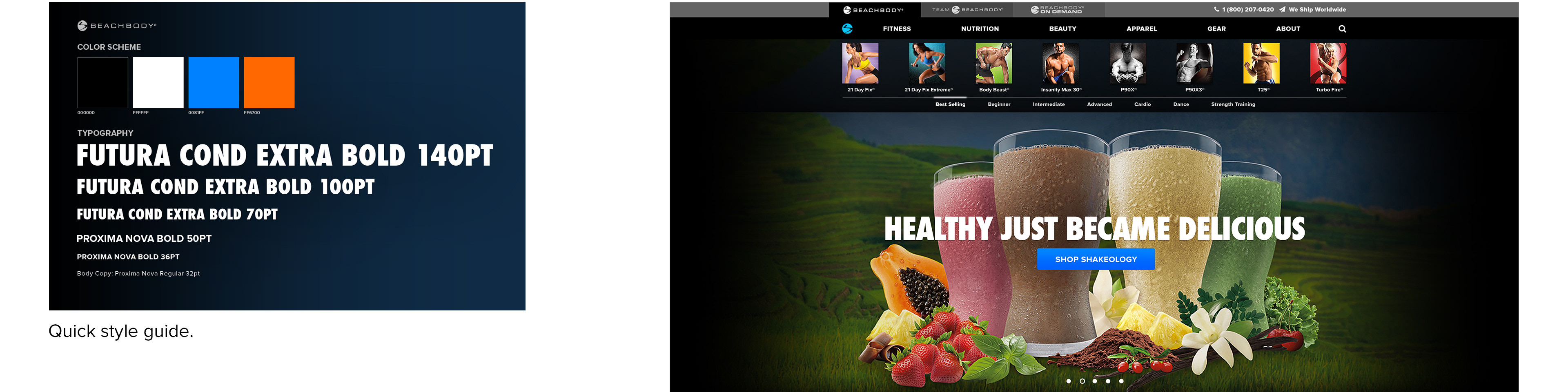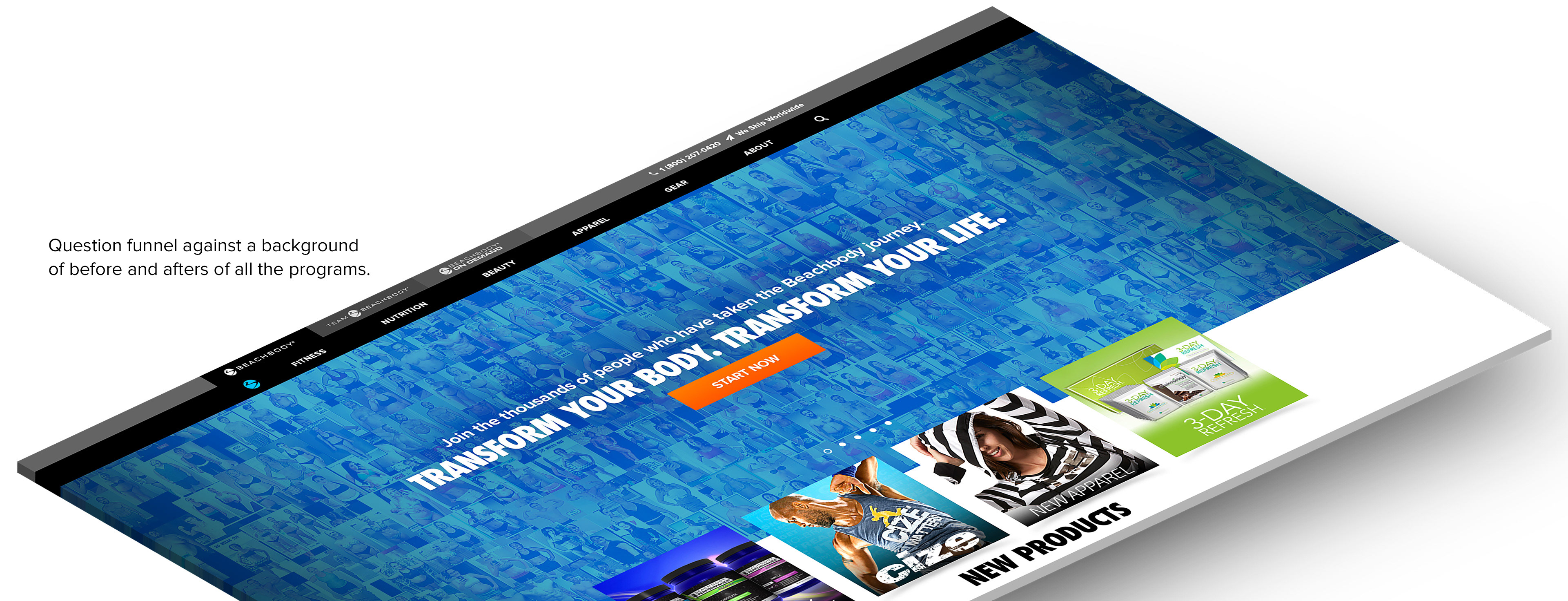 This was a project to get the ball rolling on a Beachbody redesign and we needed to pitch ideas quickly. Started with a simple style guide. Used a drop-down product sorter, similar to Apple, in the navigation where the user could sort through categories according to workout level. I saw a question funnel on another site and thought it would work well against all the before and after photos. Hope you like!