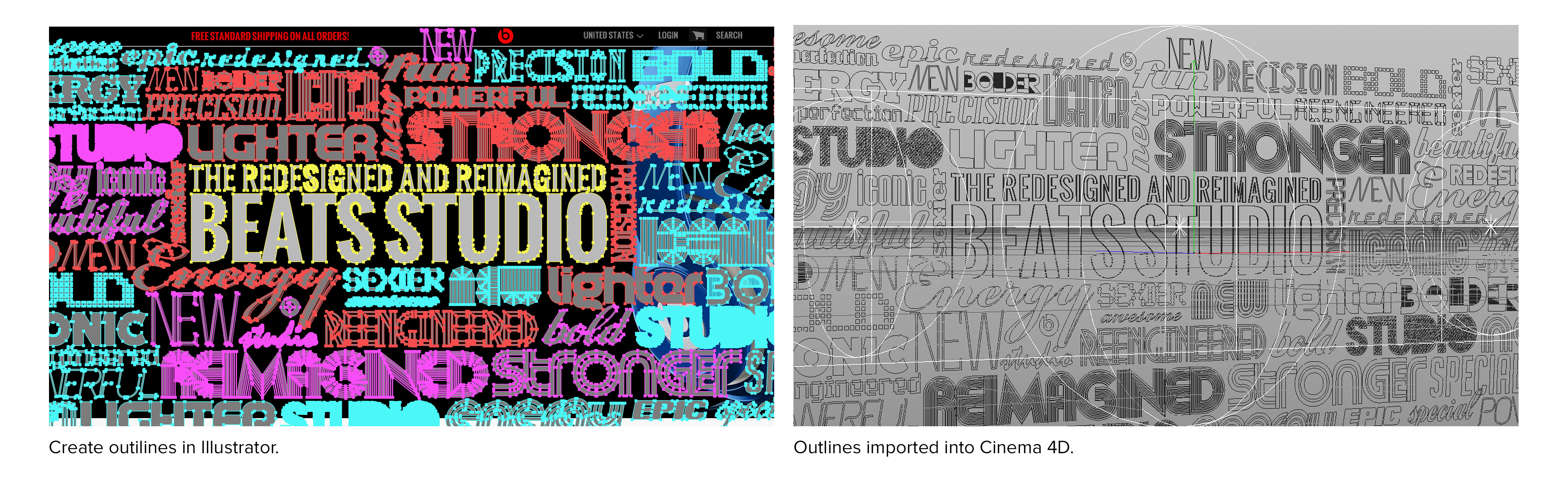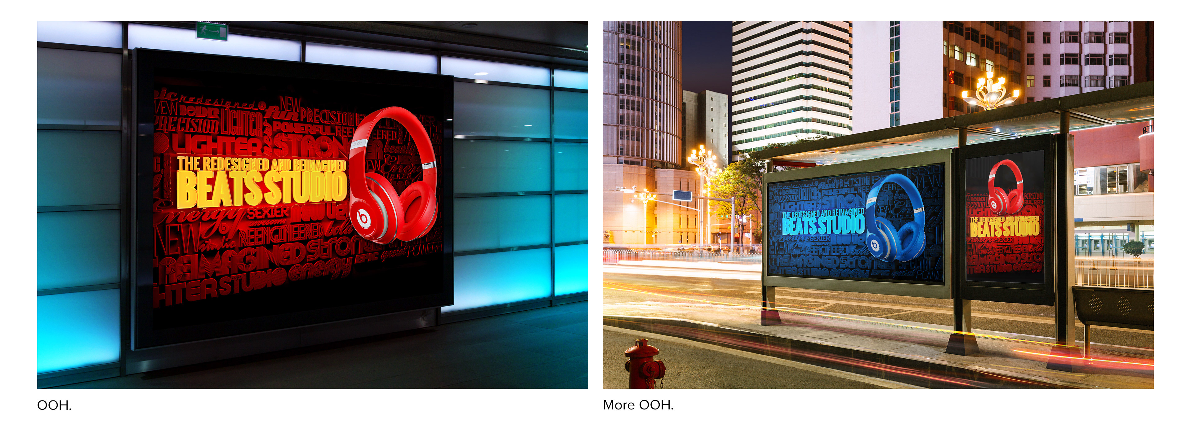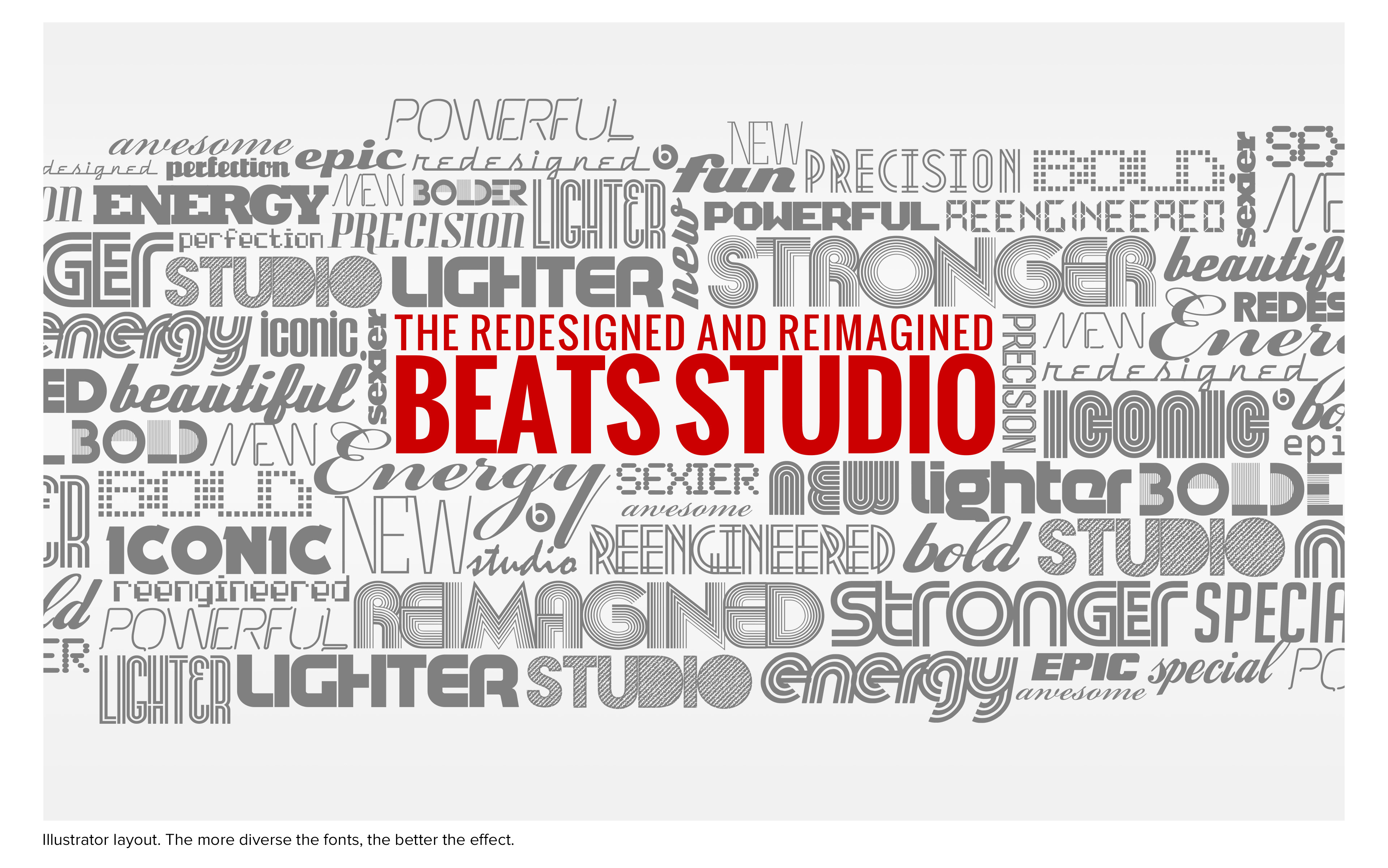 Needed a fun way to announce the redesign of Beats Studio headphones. Nothing gets someone’s attention better than a hot neon sign. Fonts were laid out in Illustrator with all the superlatives surrounding it. Then art was taken into Cinema 4D and polished in Photoshop. Here’s the process. Enjoy!